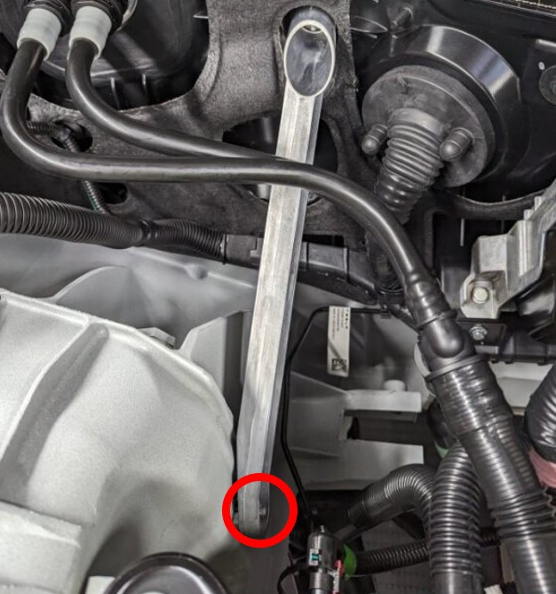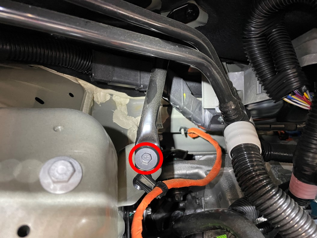 Remove the bolt that attaches the pencil brace to the chassis (torque 10