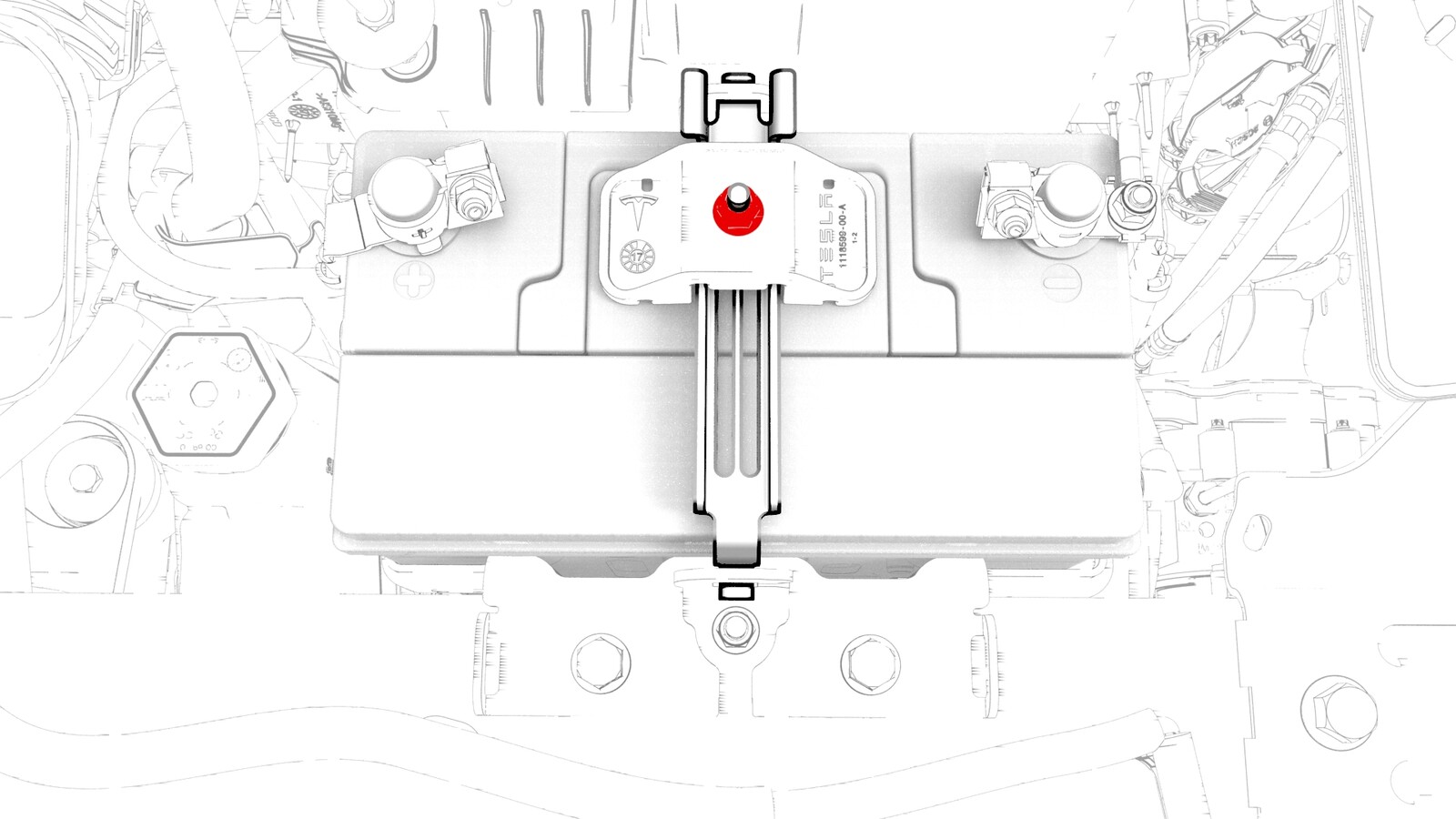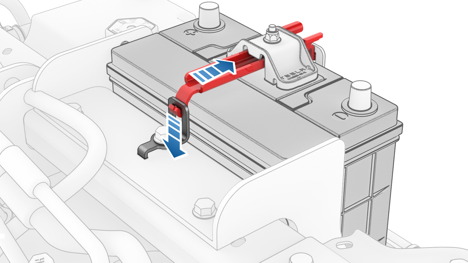 the 12V battery upper tie down bracket to the 12V battery strap.