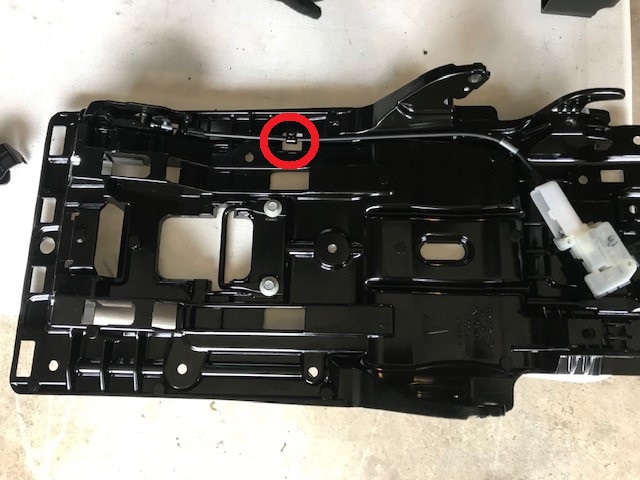 Install the plastic bracket to the 2nd row center/20 seat back.