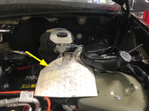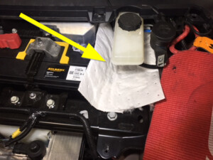 Remove absorbent material from underneath brake booster assembly and reservoir area