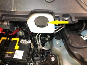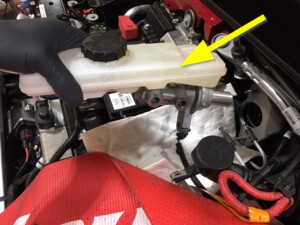 Clean area around brake fluid reservoir and remove brake reservoir cap