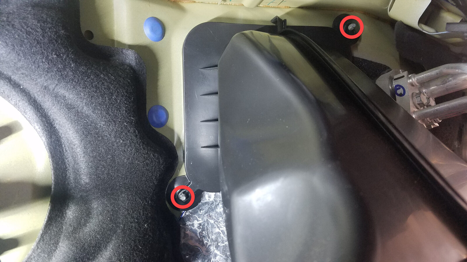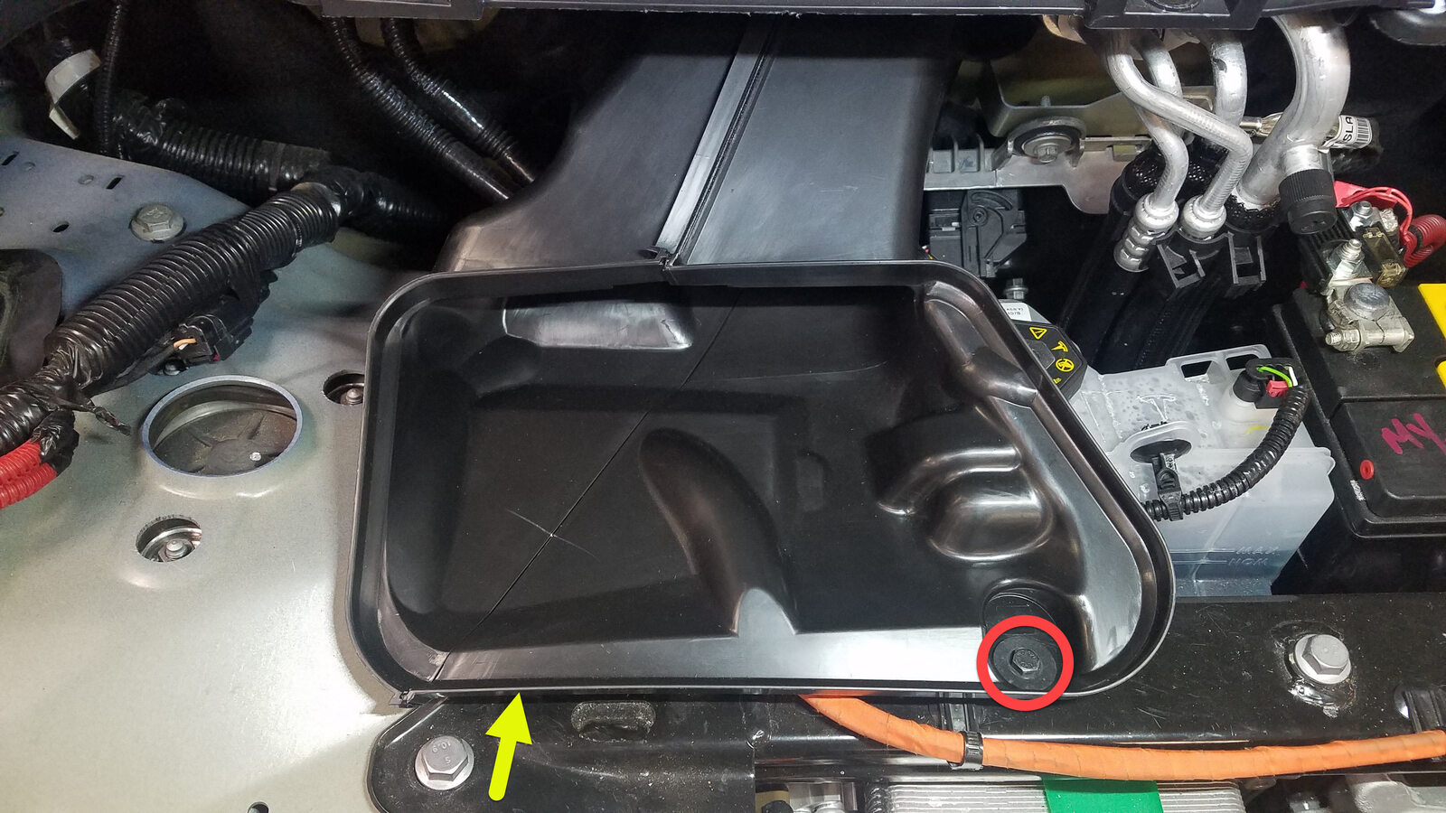 Note2x bolts, 10mm, 5 Nm, Pivot forward edge down past frunk assembly, Then carefully move rear edge past brake reservoir and into position, Gently press on RH side of filter to seat seal onto duct, Rework requires new bolts