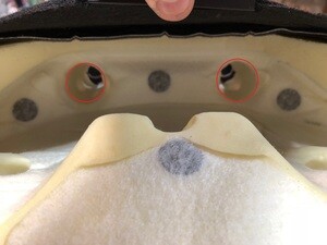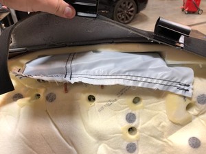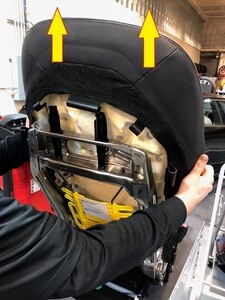 NoteStart by sliding the foam trim straight onto the seat back frame. Ensure the posts for the headrests engage the seat back foam. Ensure the heater harness and lower trim that engages the frame are pushed through to the back side of the frame.