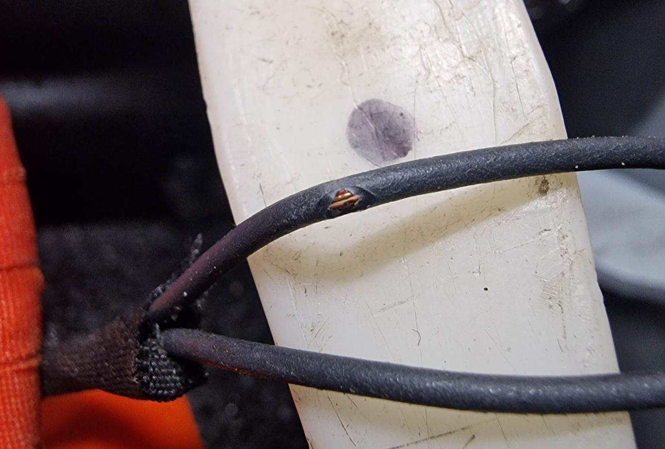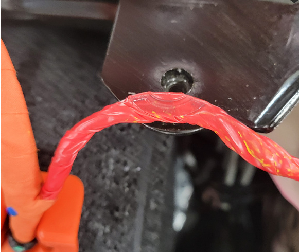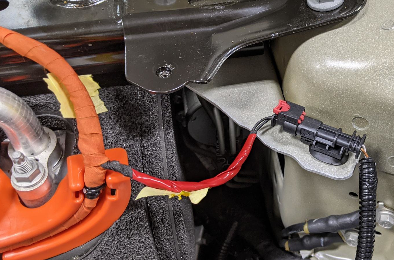 Make sure that the HVIL harness branch of the A/C compressor HV harness is properly routed away from and does not rest upon the shock tower brace.