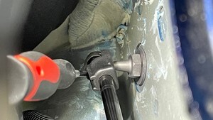 Release the clip that attaches the hood gas strut to the body mount, and then remove the hood gas strut from the vehicle.