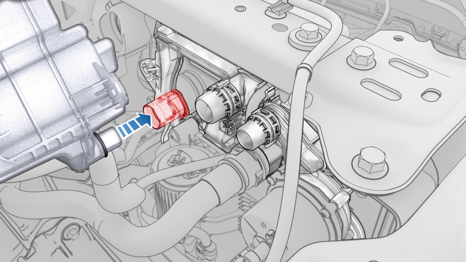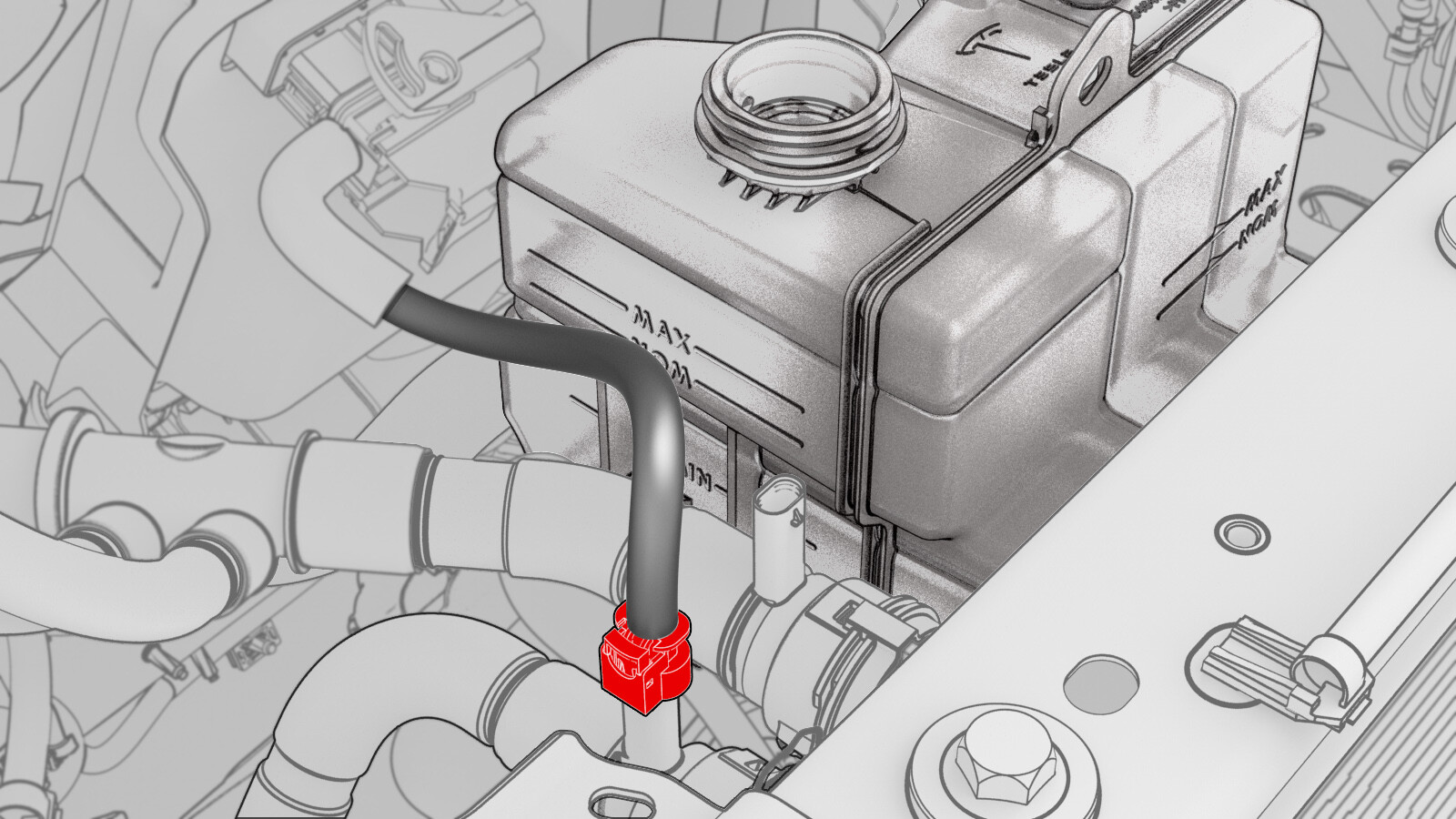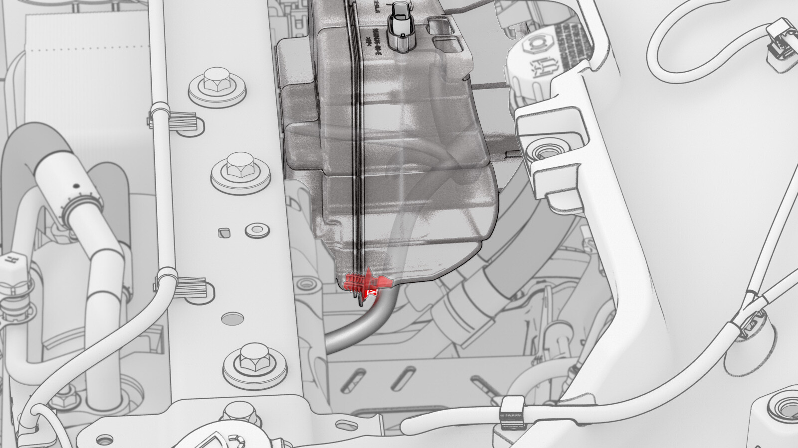 - Release the coolant bottle from the supermanifold, and move the bottle towards the rear of the vehicle to remove it.