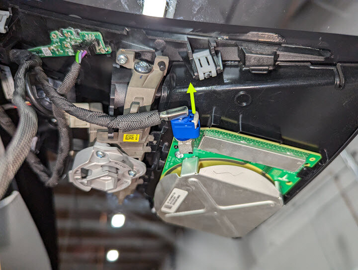 Release the clips that attach the upper quad camera cover, disconnect the interior camera connector, and then remove the upper quad camera cover and interior camera assembly from the vehicle.