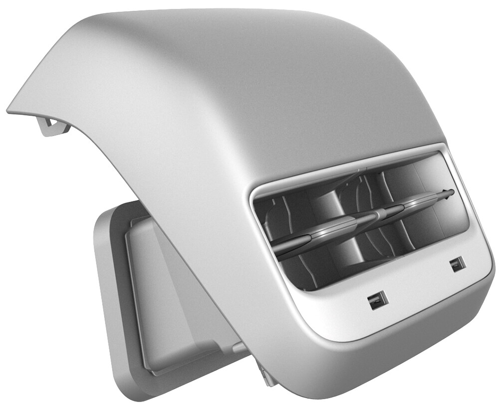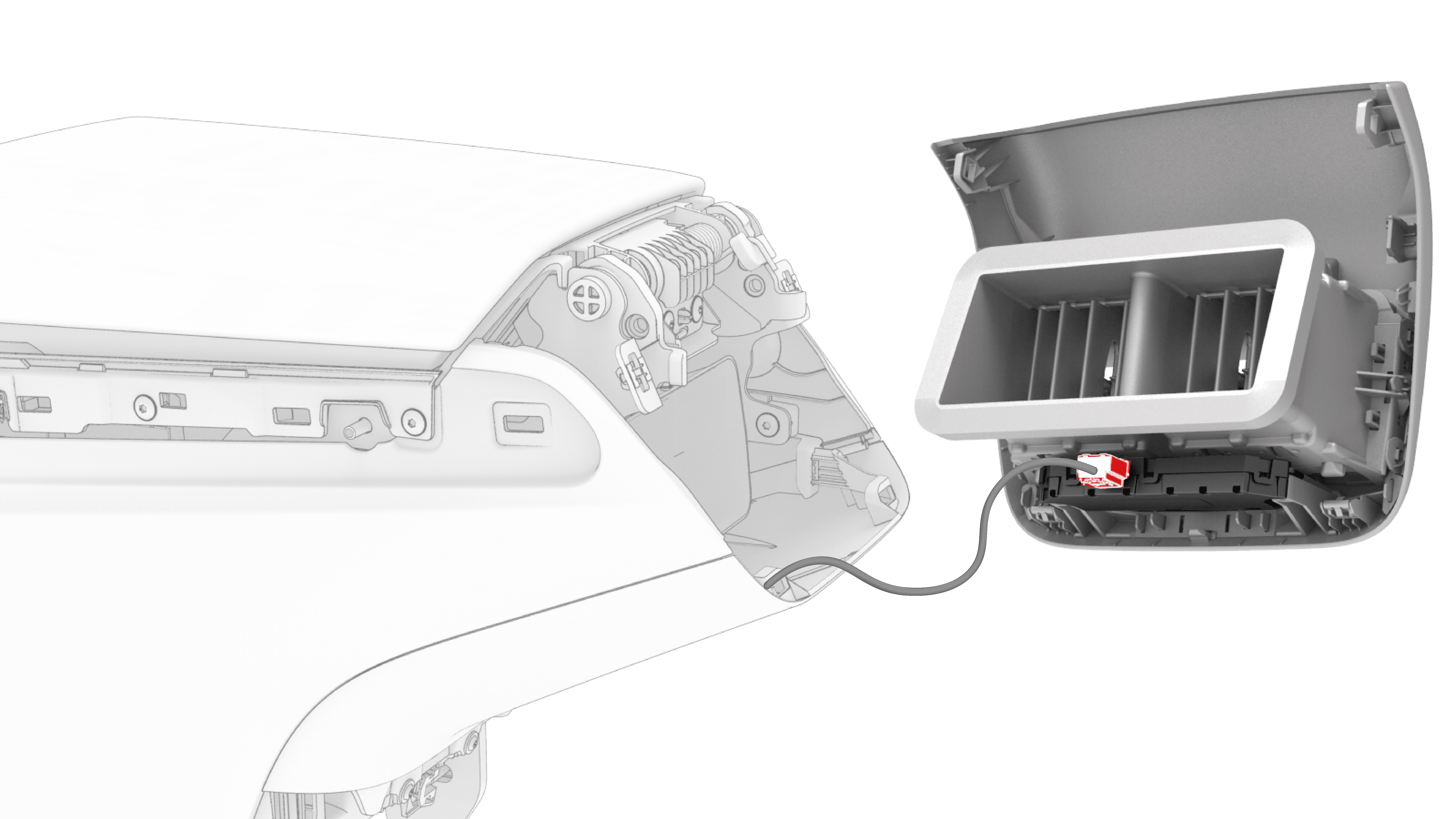 Disconnect the electrical harness from the center console rear USB hub connector, and then remove the center console rear vent assembly from the vehicle.
