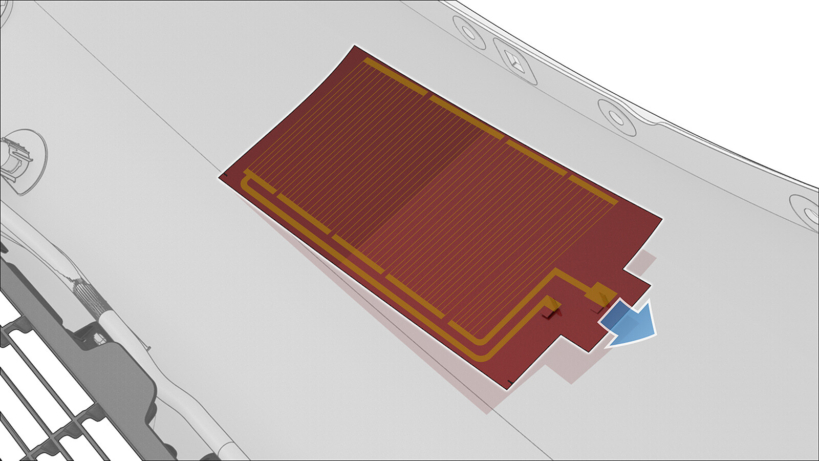 Use a plastic trim tool to release the adhesive that attaches the radar heater to the inside of the front fascia. Continue peeling the radar heater until it is removed.