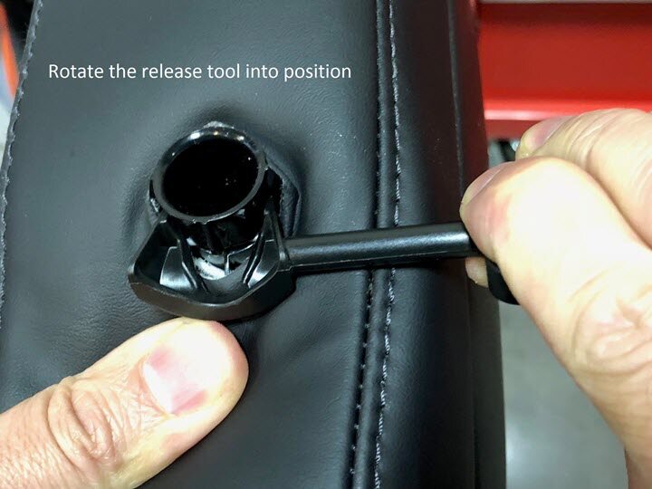 NoteDepress the material around the headrest post to expose the release clip, Ensure both tangs of the release tool engage the retaining spring, The release tool is rotated into position, Images show headrest removed for clarity