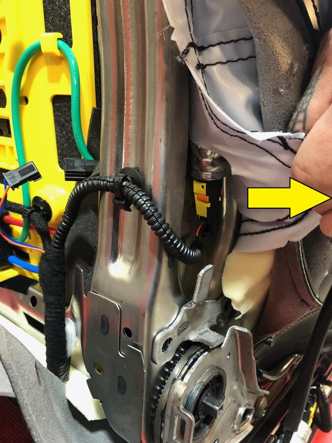 Pull RH front seat upholstery away from the air bag to gain access to the air bag electrical connector