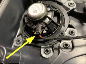 Note10x clips, 3x fir tree clips, 4x connectors, Secure harness clip first to make sure speaker connector and underside white task light connector are not swapped, then make harness connections, Slide top portion of panel into door seal first, then swing bottom into place, Ensure all clips are seated