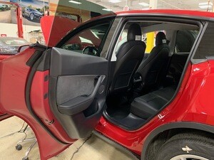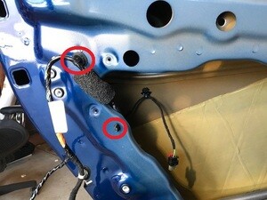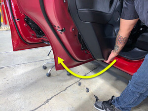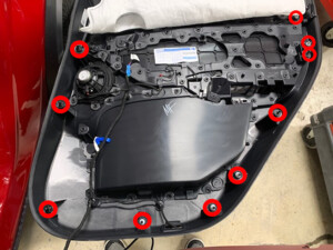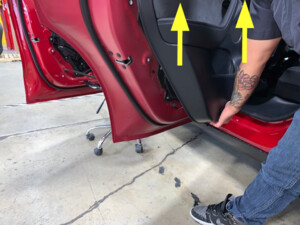 Remove fasteners securing LH rear door panel under armrest and door trim handle