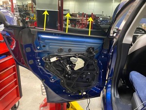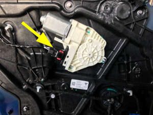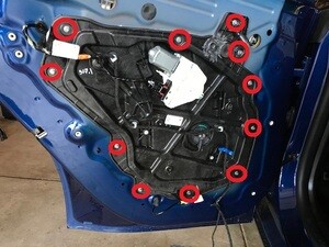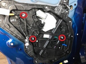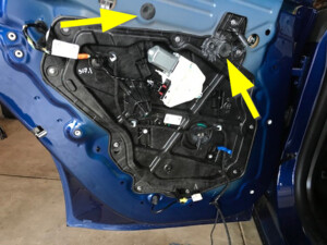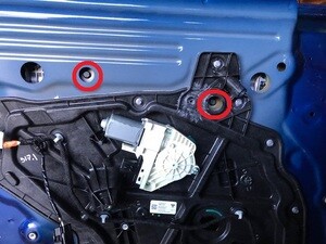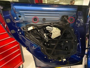 Note2x bolts, 10mm, 8 Nm, Remove bolts, then slide closeout panel assembly down and out, Window regulator and closeout panel come out as one piece