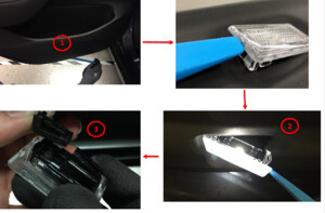 Note4x clips, 1x connector, Insert the trim tool to release C-notch toward front of door, then disconnect white task light with small flat screwdriver before removing it, Caution: harness very short