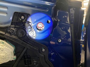 Remove circle button plugs covering openings in door for access to regulator guide blocks