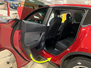 Note5x clips, Rear edge is mated with groove in trunk side trim, Install rear edge of LH rear sill trim into trunk side trim and work your way forward securing clips