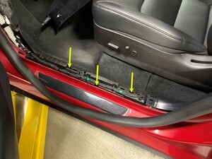 Note5x clips, Rear edge is mated with groove in trunk side trim, Release clips at the front of LH rear sill trim working your way back towards rear of sill trim