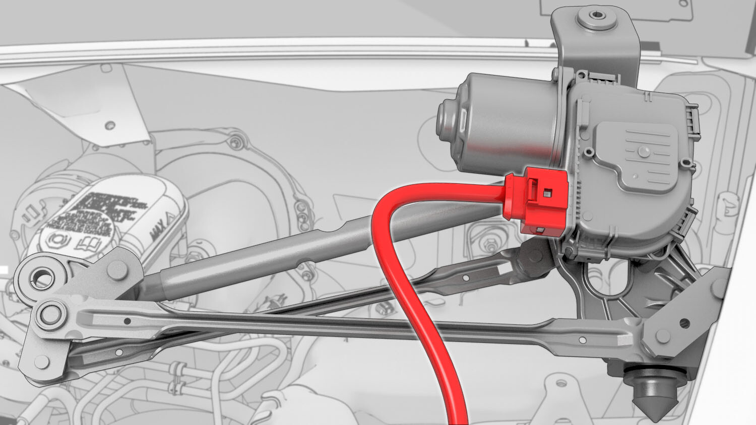 With the wiper module facing upside down, connect the electrical connector. Afterwards, rotate the wiper module towards the rear of the vehicle to ensure proper harness clearance.