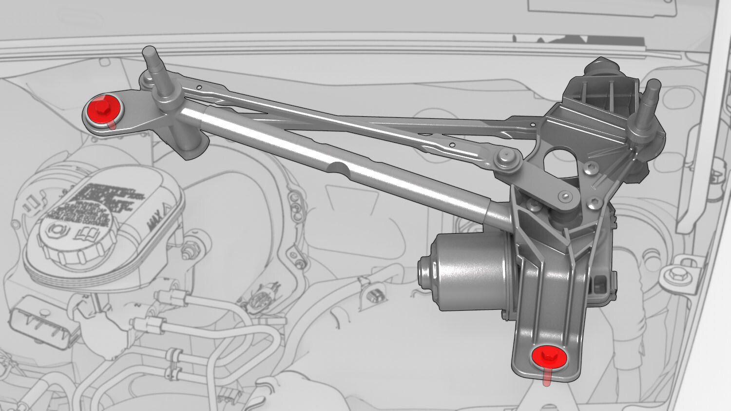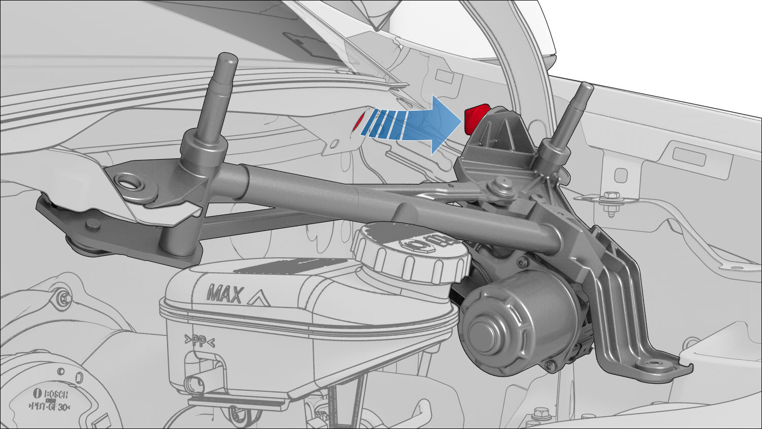 Carefully push the wiper module towards the rear of the vehicle so that the rubber anchor inserts into the bracket on the bulkhead.