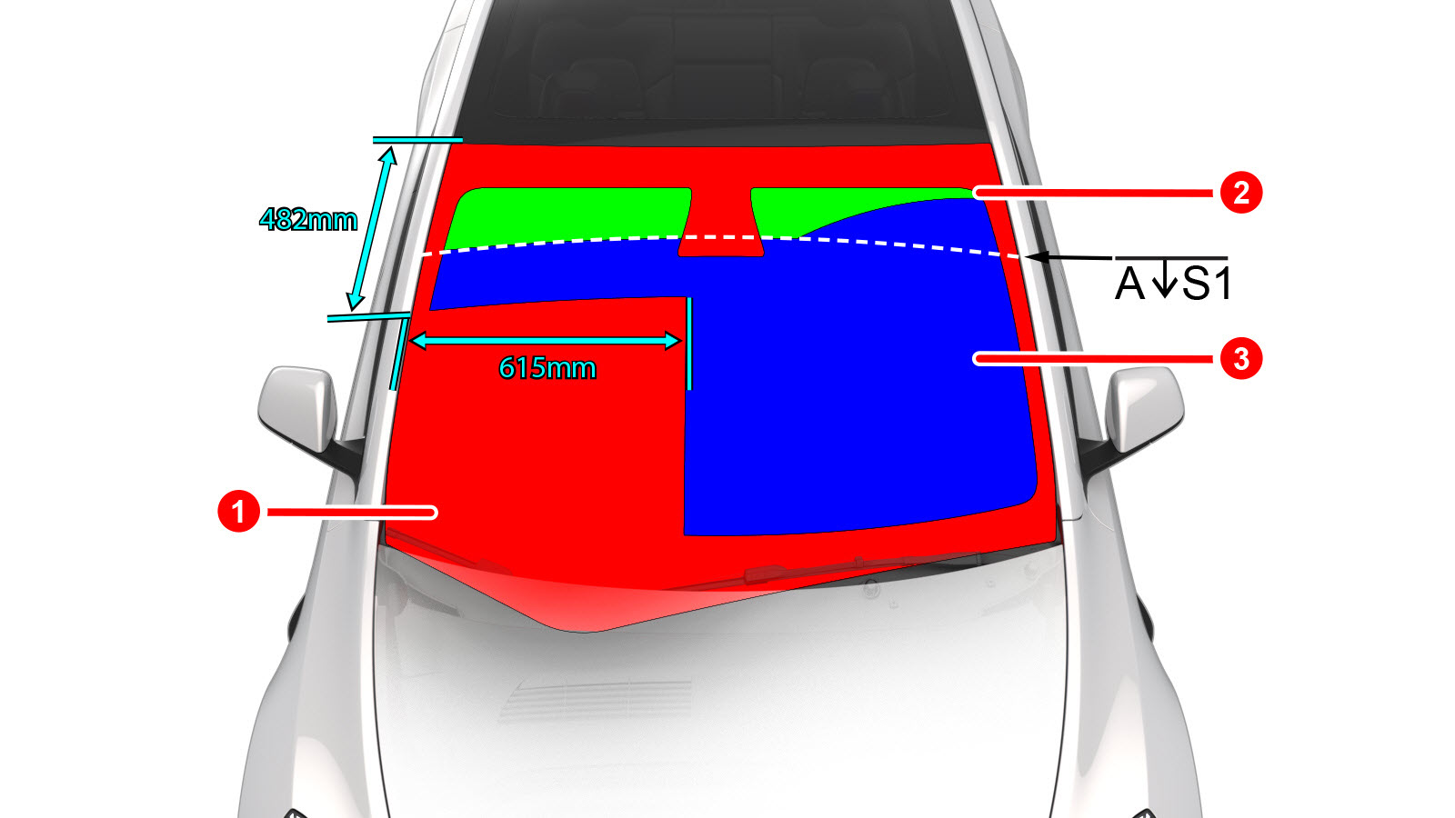 Area 2 (shown in green in the images above) Repair area 2 is a curved area from the edge of the upper Frit area down to the AS1 line (145 mm below the edge of the upper Frit area). |
