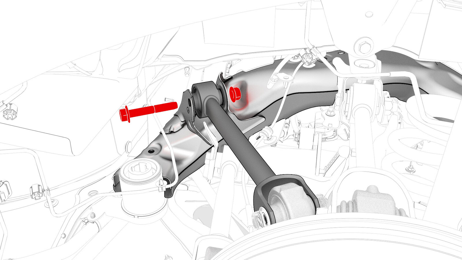 NoteTurn the bolt a few times to feed the end out while maneuvering the upper fore link to allow just enough space to remove the link from the rear subframe. Refer to the video above. -