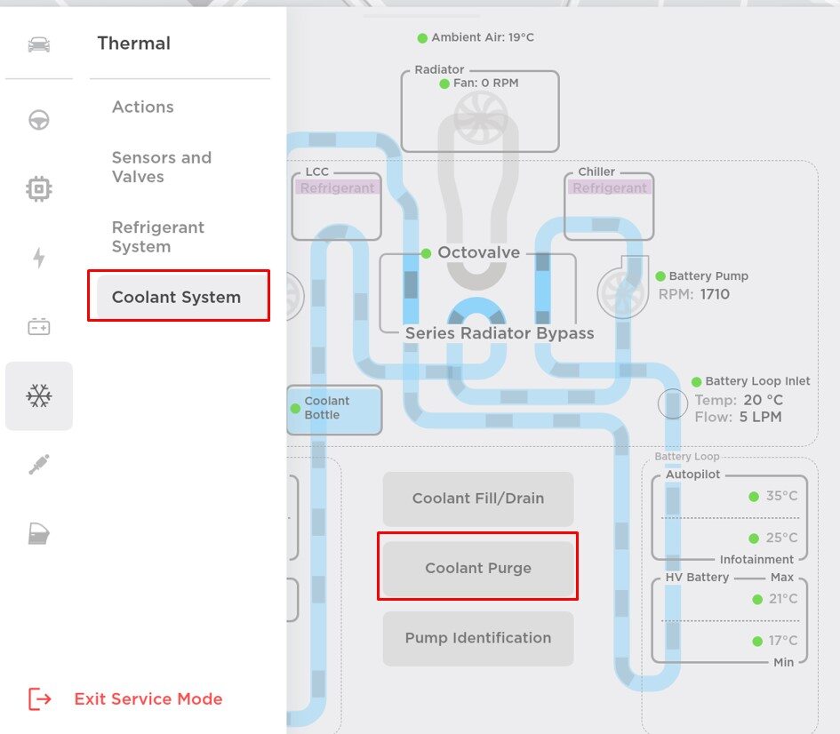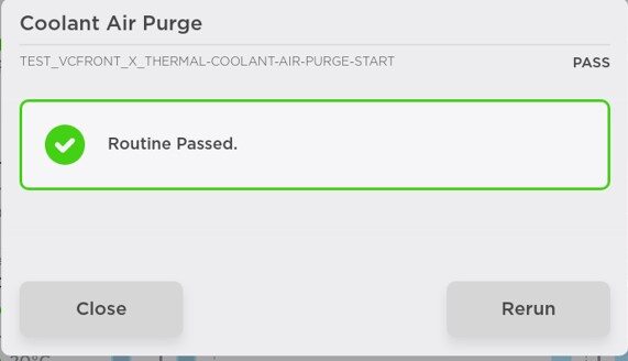NoteMake sure the vehicle is not in "Drive". Putting the vehicle into "Drive" will stop this routine. Wait until the coolant pumps stop running (audible noise). "Routine Passed" will appear, but the pumps will run for approximately 10 minutes. If another routine is initiated during this time, it will fail. The routine is still running despite the completed message. Speeds can be monitored in garage under PT Thermal tab. Idle speed = ~1,500 RPM. The test will vary speeds from 3,500-6,500 RPM and actuate valves between SERIES and PARALLEL. If speeds hover at 7,000 RPM, this indicates the pumps are air locked. If the pumps are air locked, perform a coolant system vacuum fill (see Cooling System (Vacuum Refill)), and then continue to add coolant and purge until the coolant level reaches between the NOM and MAX lines on the bottle.