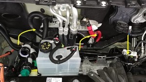 - Position a coolant drain container underneath the LH front of the HV battery.