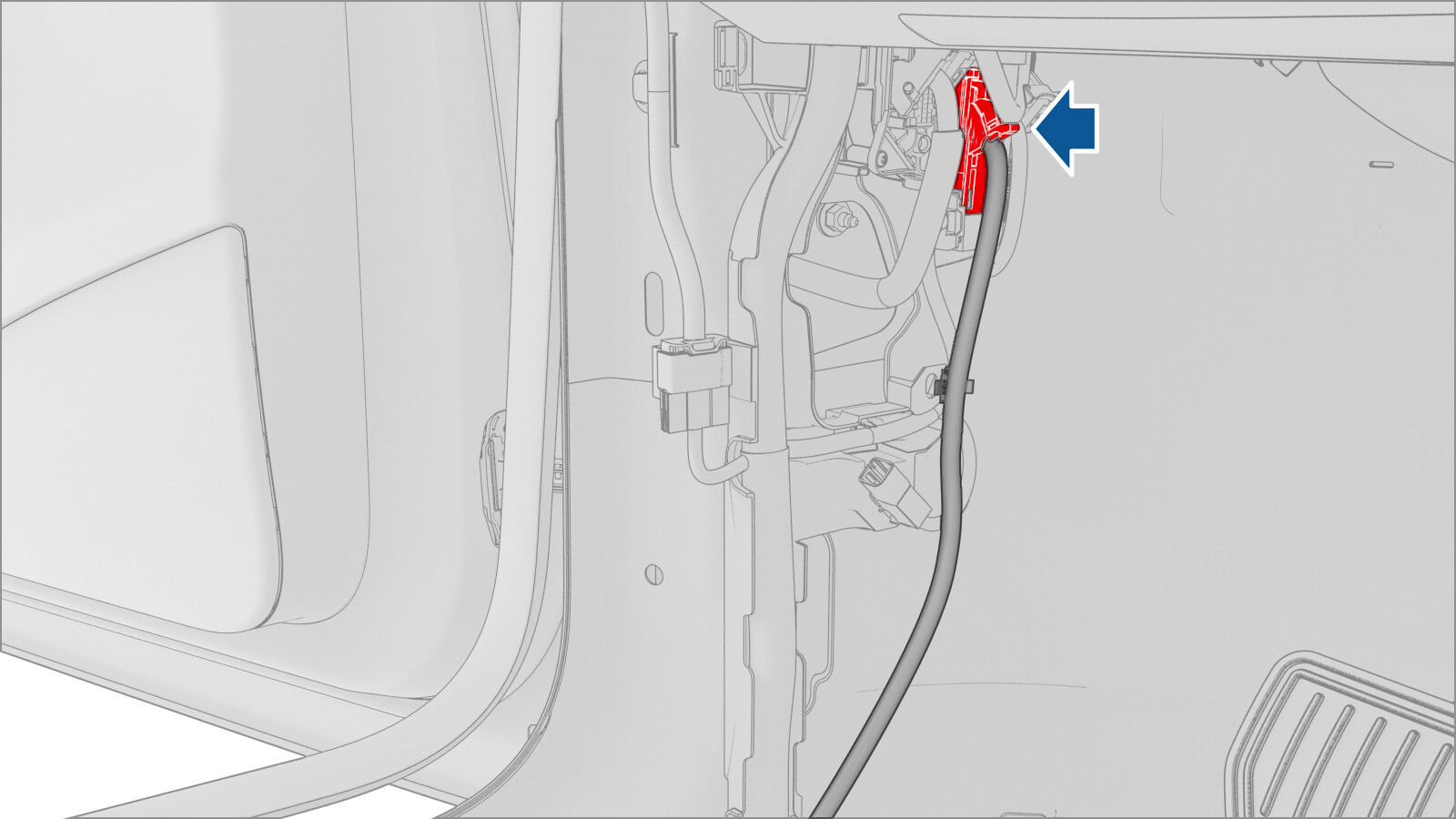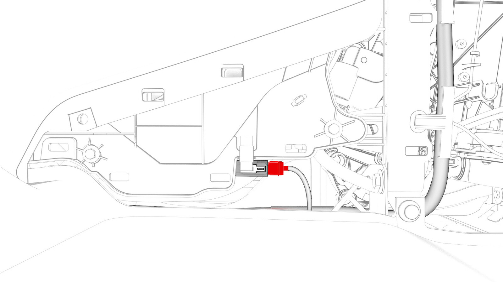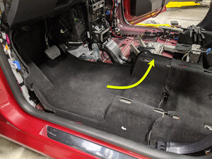 - Pull the LH front seat harness out from under the LH front carpet.