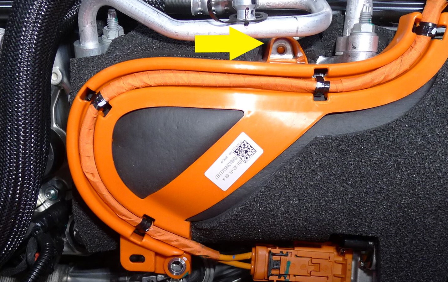 NoteMake sure the HV harness bracket engages with the harness mount on the top of the A/C compressor, as indicated.