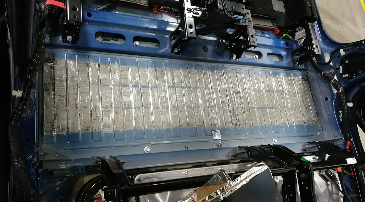 Apply a butyl patch to both sides of the center underbody assembly, and