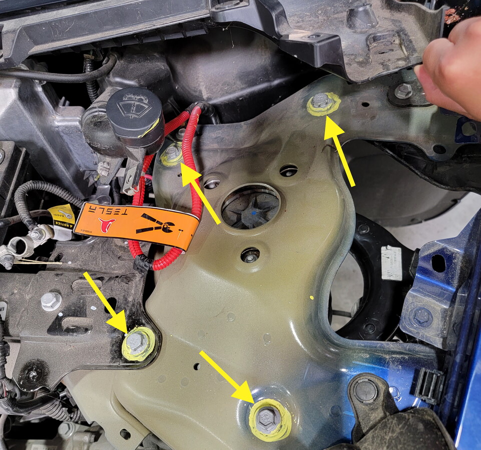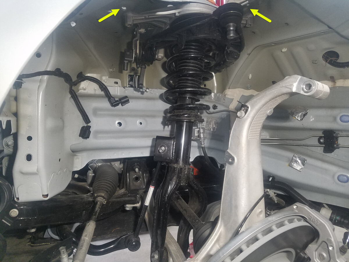 Figure 11. Model 3 shown; Model Y similar. Wheel arch liner removed for clarity. - Lower the vehicle so that the shock tower is accessible. If the lift cannot be locked in that position, set the lift to its lowest lockable position and use a step stool to gain access to the shock tower.