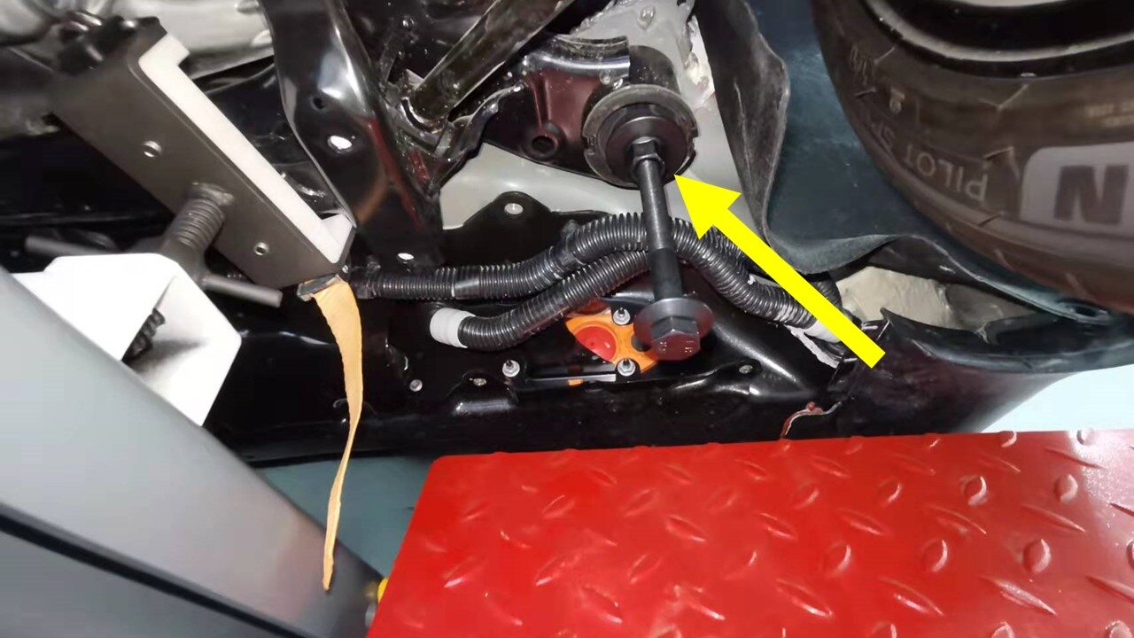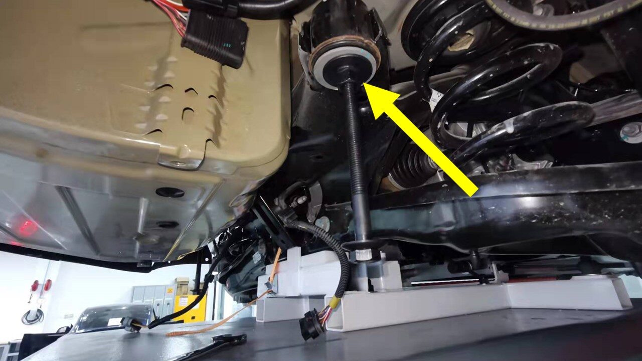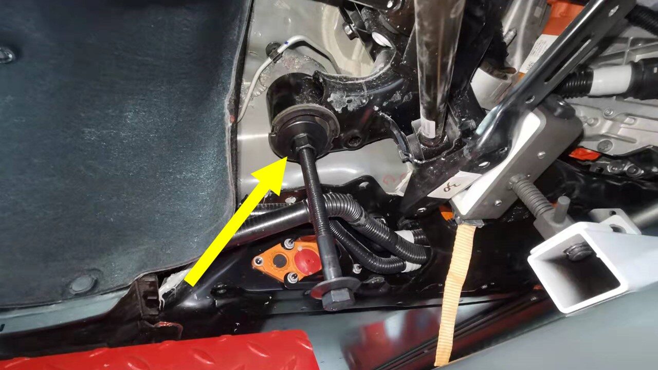 - Remove the subframe lifting tool from underneath the vehicle.