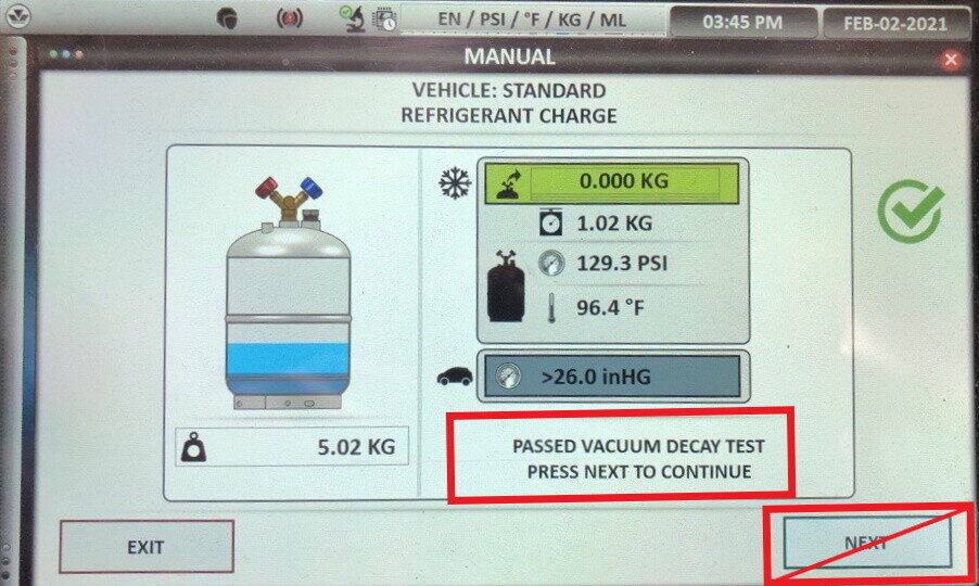 - Perform steps 1-3 as instructed by the A/C machine. After completing step 3, touch Next to begin the vacuum leak test.