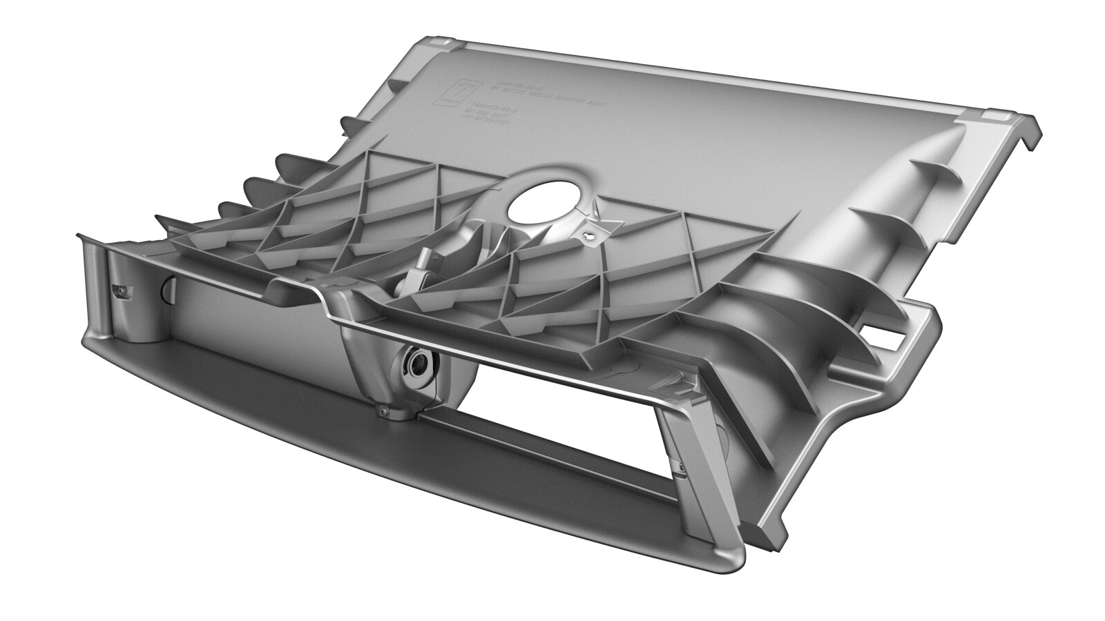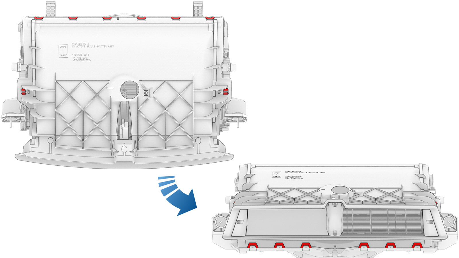 Install the active grille shutter onto the cooling fan and shroud assembly, and then fasten the locking tabs (x14) that attach the shutter to the assembly.