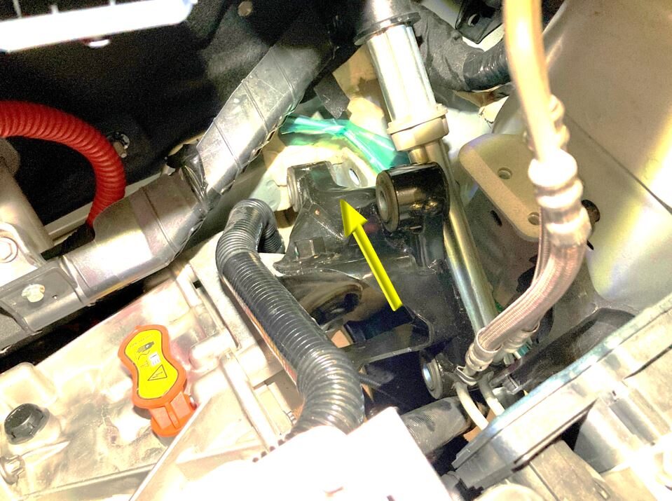 NoteLift the mount up and pivot slightly forward, then slide it up to remove it. Take care not to damage any brake line or the front rail panel. Assistance is recommended below the vehicle to move the transmission jack as needed.