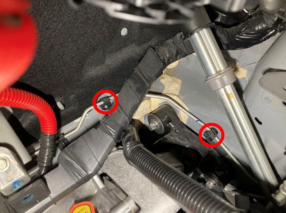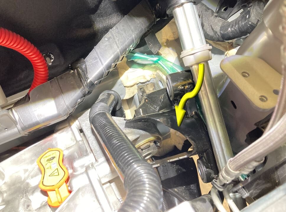 - Set up ladder to the front of the car to perform required steps in the frunk area when the car is on a 2 post lift and the FDU is on the transmission jack support.