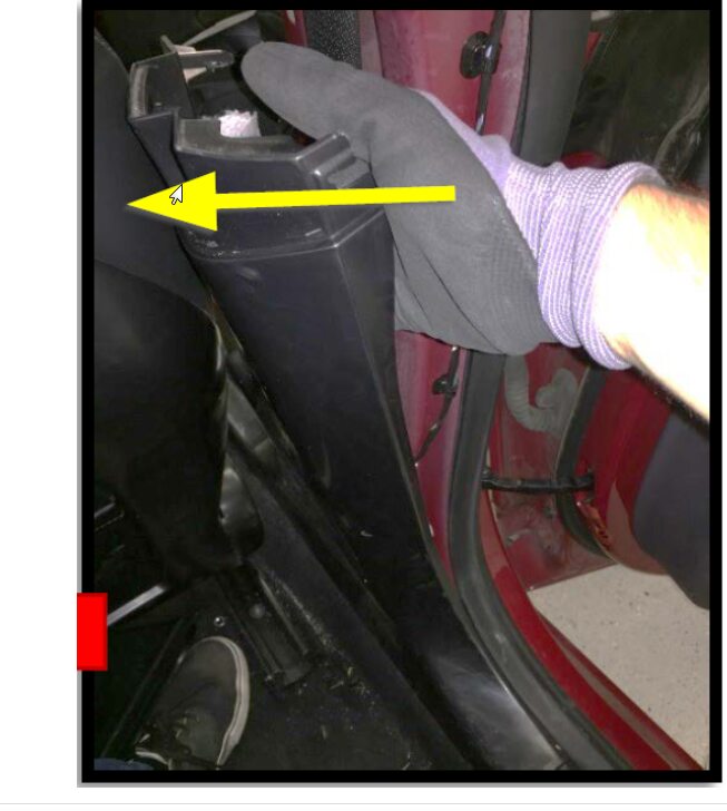 Note6x clips, 2 guide tabs, Pull rear of lower A-pillar upward to release clip then pull rearward to release trim panel
