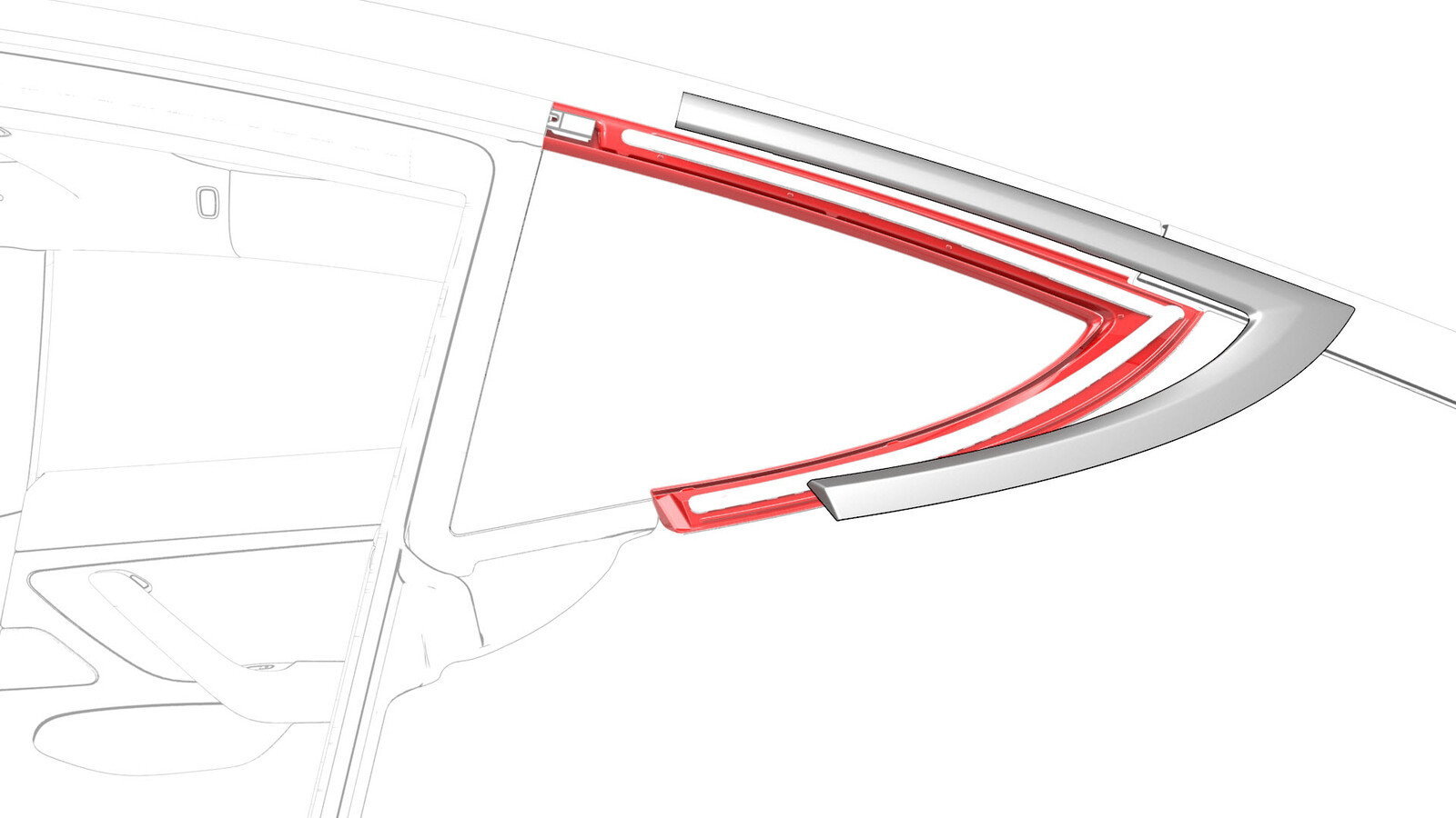 Position the LH rear quarter body glass over the vehicle and slide the rear quarter brightwork clip into the upper brightwork.