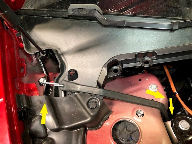 Remove the LH and RH outer bolts that attach the shock tower brace to the body, and then remove the shock tower brace from the vehicle.