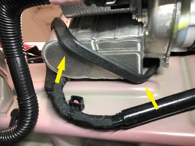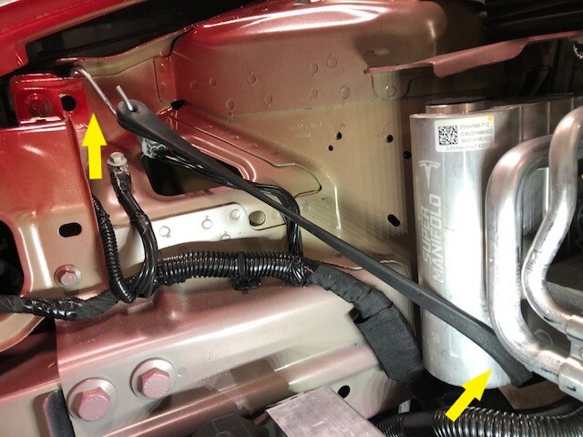 Install bungee cord to RH hood strut bracket. Route bungee cord around accumulator housing and secure to the RH body side. Do not secure bungee cord around coolant pumps or plastic housing on supermanifold. Use a mirror as needed to visual check bungee cord around accumulator housing.