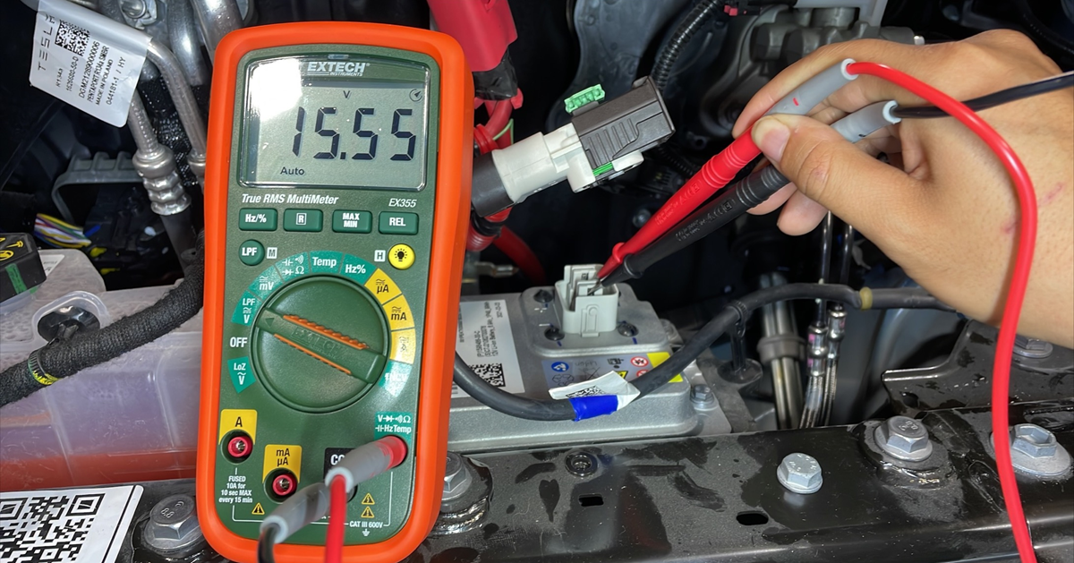 NoteIf the voltage across the battery terminals is 0, the battery may have switched off internally. Use a 12V Lead Acid battery for testing. For mobile technicians: use the 12V Lead Acid battery in the Mobile Service vehicle.CAUTIONIf the voltage across the battery terminals is less than 13 volts or greater than 16 volts, the multimeter is not measuring reliably and must not be used.