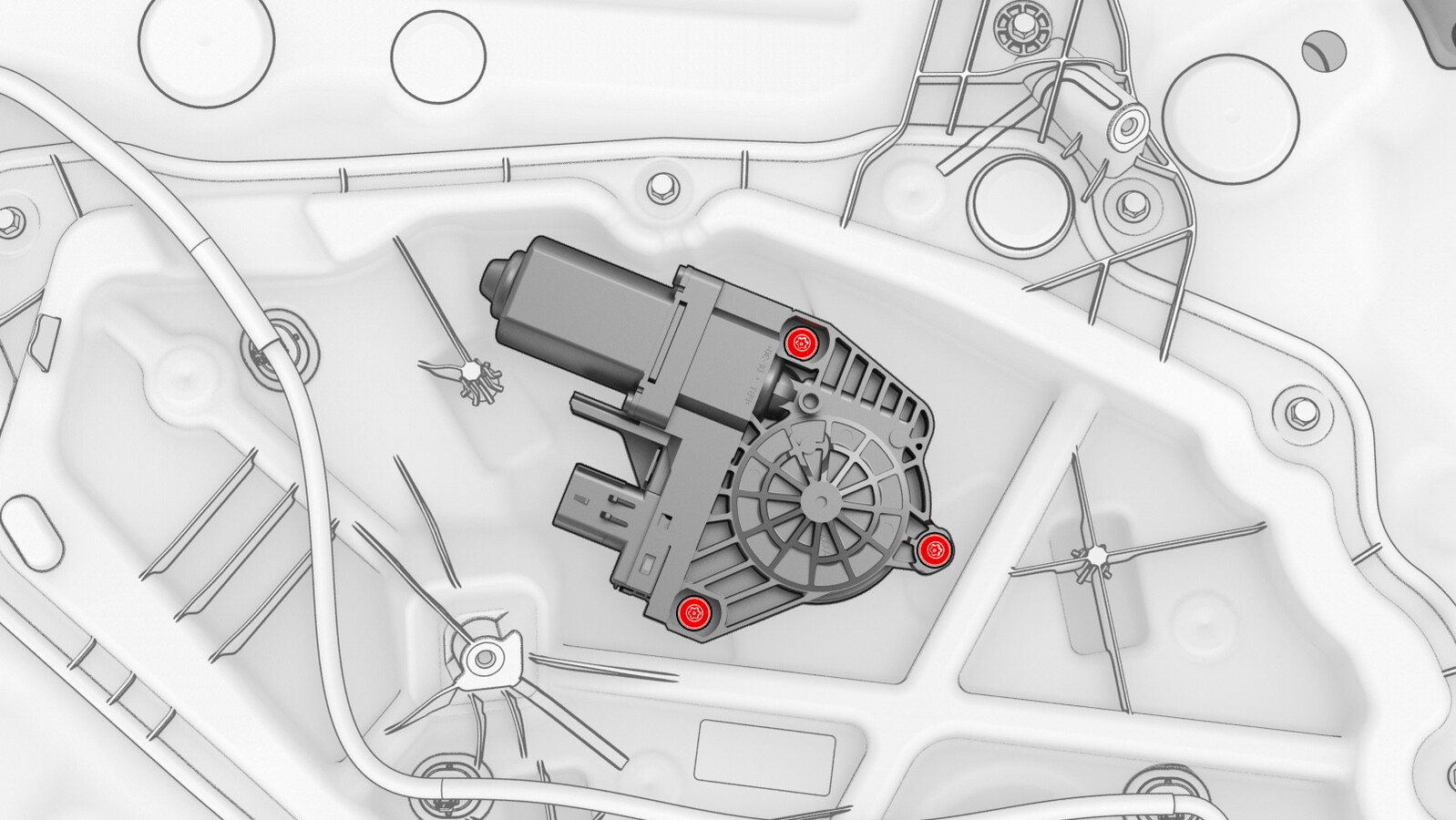 Position the LH rear window regulator motor onto the closeout panel, and then install the screws that attach the window motor to the closeout panel.
