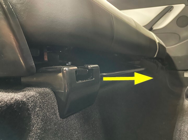 Release the clip that attaches the RH 2nd row seat track cover to the seat
