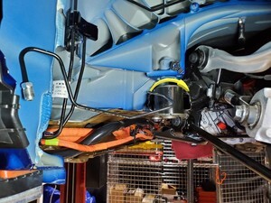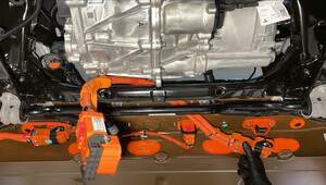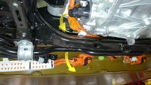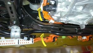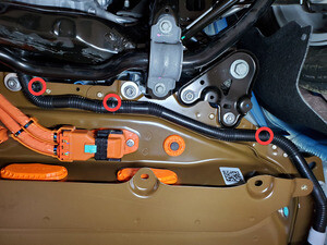 Loosen large bolt securing RH shear plate and subframe to body and rotate shear plate clear of HV battery