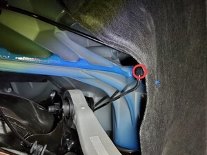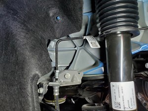 Note2x bolts, 10mm, 5 Nm, Pivot forward edge down past frunk assembly, then carefully move rear edge past brake reservoir and into position