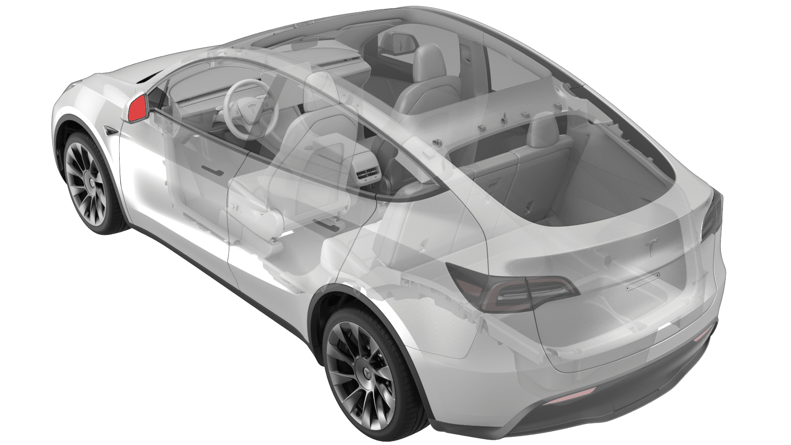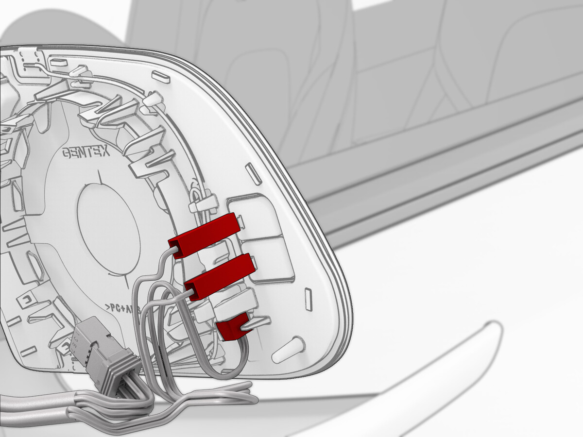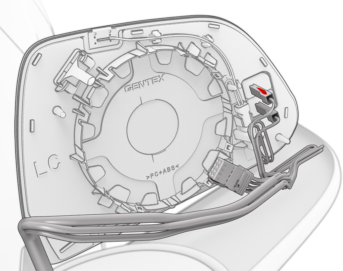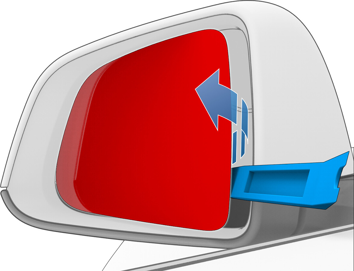 NoteWhen aligned correctly, the metal tab on the door mirror glass goes the top right of the door mirror assembly.CAUTIONTake care not to damage component(s).