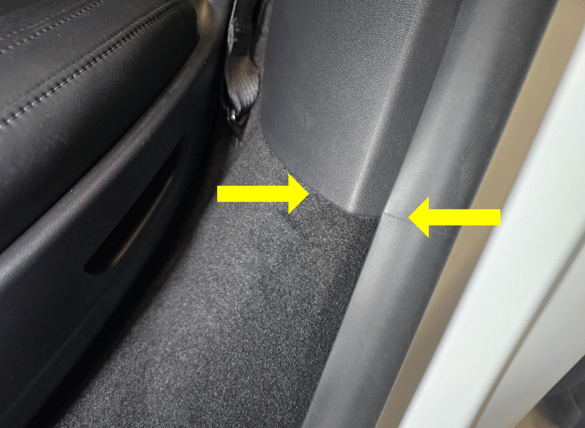 Figure 1. For vehicles built at Fremont and Austin, make sure the seam on the seal is even with the LH upper B-pillar. Figure 2. For vehicles built at Giga Shanghai, make sure the seam on the seal is even with the bottom of the LH lower B-pillar. Figure 3. For vehicles built at Giga factory Berlin, make sure the seam on the seal is even with the bottom of the LH lower C-pillar trim. -