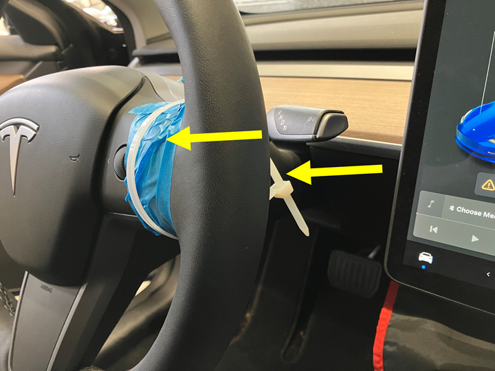 NotaAplique cinta adhesiva alrededor de la posición de las 3 en punto del volante para protegerlo e instale la brida alrededor para permitir un movimiento de tracción lateral. No apriete la brida por completo.