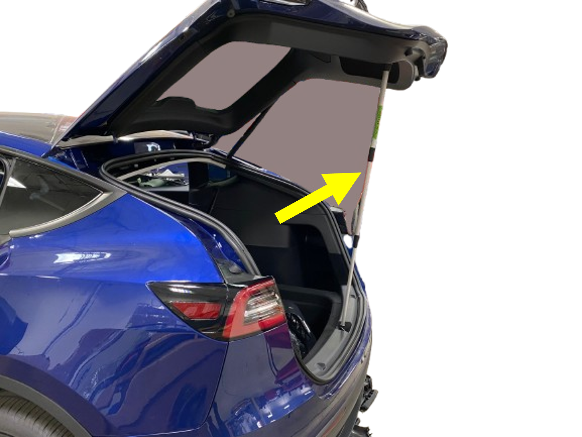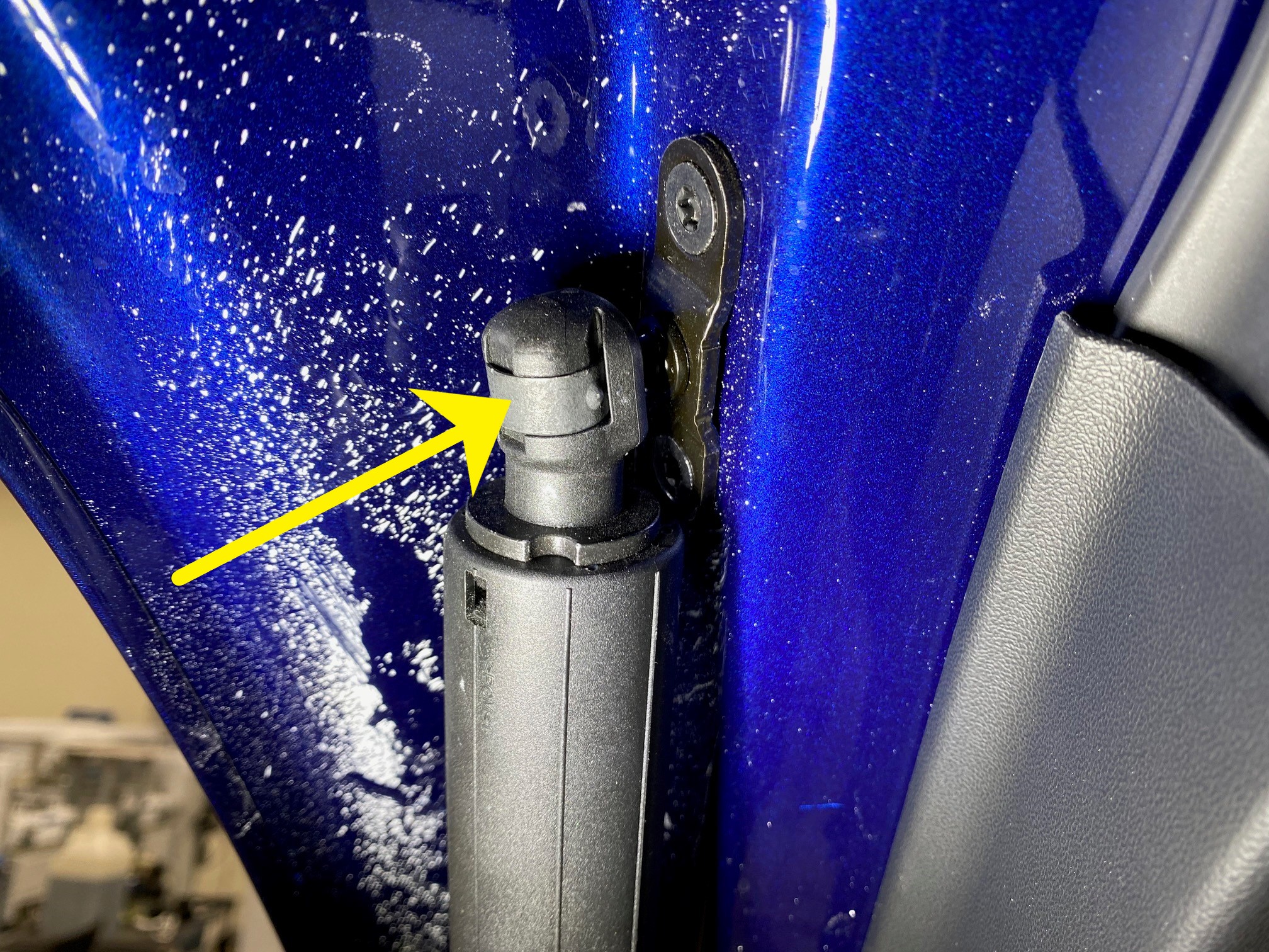 Avec de l'aide, installez l'attache supérieure gauche du vérin électrique sur le pivot à rotule au niveau du hayon.